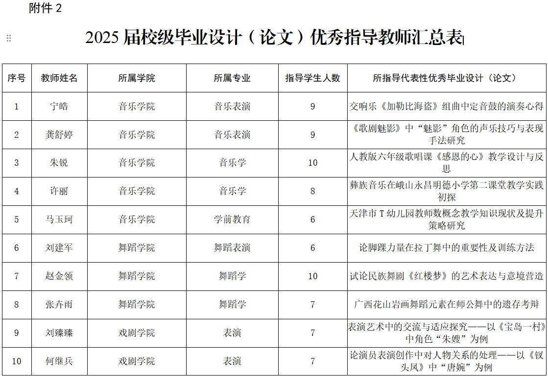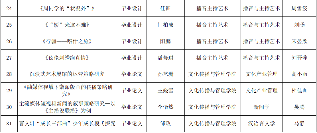 根据学校《关于2025届校级优秀毕业设计(论文)和优秀指导教师评选工作通知》《优秀毕业设计(论文)及优秀指导教师评选办法》要求,学校组织开展校级优秀毕业设计(论文)和优秀指导教师评审工作,依据申报要求及推荐名额,严格按照“学院推荐、资格审查、学院互评、专家论证、学校审议”等程序进行评选,在各学院推荐的34份校级优秀毕业设计(论文)和34名校级优秀指导教师中,共评选出2025届校级优秀毕业设计(论文)31份和校级优秀指导教师31名。现将评选结果予以公示: