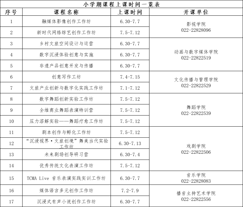 根据学校教学工作安排,我校2024-2025学年夏季小学期教学活动已上线,快来看看具体安排吧! 开 课 时 间 夏季小学期上课时间为6月30日至7月15日,每门课程开课时间不同,各位同学请根据自己实际情况进行选课。 选 课 安 排 夏季小学期选课时间为6月25日14点-6月29日21点,2022、2023、2024级在校生均可选课,学生可通过关注公众号-教学动态-教务系统。(http://172.16.1.14/jwglxt)进行网上选课,为方便学生选课,已将登录密码重置为:Tjcm身份证后六位@ 选课完成后仔细核对个人选课信息,避免错选漏选影响个人学习计划。 如有疑问请联系开课单位
