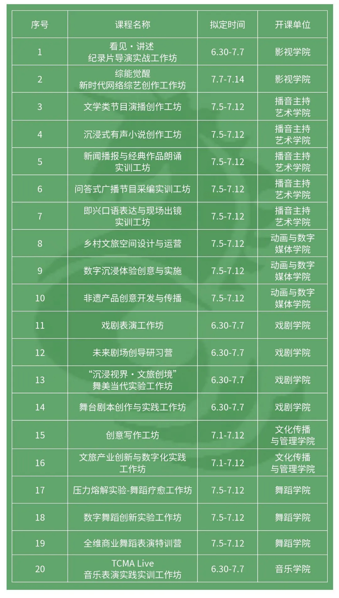 关于夏季小学期 夏季小学期是对常规学期教学模式的有益补充,旨在通过拓展教学时间和形式,为学生提供更多元化的学习和实践机会,强化实践育人,培养拔尖创新人才。 开设小学期的目的与意义 1. 优化课程体系:提供丰富优质的国内外课程资源,打破专业壁垒,促进学科交叉融合。 2.提升实践能力:通过工作坊、校企合作课程、专业实习等形式,增强学生动手能力和创新思维。 3. 拓展视野:引入行业一线专家和知名学者授课,帮助学生了解前沿动态,提升职业竞争力。 4. 促进交流:加强校际、校企合作,为学生搭建更广阔的学习与发展平台。 时间安排 2025年夏季小学期课程开课时间参照下表《小学期拟定课程一览表》,采取集中授课形式,学生根据专业需求与兴趣,在不影响期末考试前提下,结合自身实际情况自愿选择,大部分课程面向全校学生跨学院、跨专业选课。 教学形式 本次小学期教学师资团队均为来自中国传媒大学、中央戏剧学院、北京舞蹈学院等高校的知名学者教授及来自传媒、文旅等行业企业一线专家。课程分为通识课程和实践课程两大类,以工作坊综合实践课程、校企合作课程、专业实习等多种形式的实践活动为主。课程教学形式多样、考核方式灵活,充分发挥教材、资源和师资优势,为学生拓展知识视野、提高创意创作和技术应用能力提供平台。通过问题导向、项目驱动等教学方式,培养学生动手能力和创新思维。开设跨学院、跨专业的课程与项目,充分利用校内外资源,为学生提供丰富的综合实践机会。 《小学期拟定课程一览表》