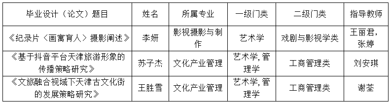根据天津市教委《关于做好第十六届天津市级本科生毕业设计(论文)评选工作的通知》要求,经学校审查决定,推荐我校影视学院影视摄影与制作专业2025届毕业生李妍、文化传播与管理学院文化产业管理专业2025届毕业生苏子杰和王胜雪的毕业设计(论文),参加第十六届天津市级本科生优秀毕业设计(论文)评选,现予以公示。