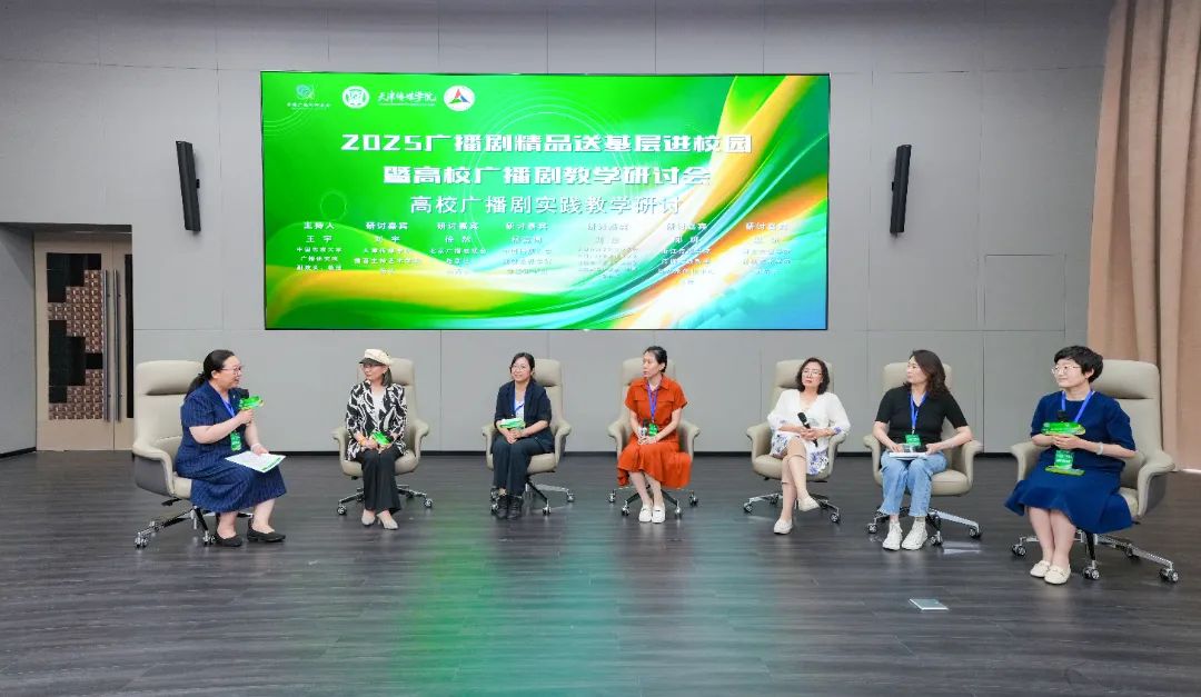 高校广播剧实践教学研讨由中国传媒大学广播研究院副院长王宇教授主持,中国传媒大学戏剧影视学院党委副书记杨竞博、浙江传媒学院传媒实践教学与艺术创作中心主任郦娜、天津传媒学院客座教授刘沙、天津传媒学院播音主持艺术学院院长刘宇,河北传媒学院影视艺术学院副院长梁锐,北京广播电视台燃剧社负责人徐然围绕高校广播剧教学与创作展开深入讨论。嘉宾们介绍了跨专业联合课程建设、技术赋能、校台合作等广播剧领域的创新举措,提出了许多建设性的意见与建议。刘宇院长介绍了学院开设的“影视剧配音和广播剧演播方向”的课程内容与教学方式,并表示天津传媒学院“以德铸魂、以文化人、以创带教、以产促学”的办学特色,为播音主持艺术学院的广播剧教学提供了有效支撑。