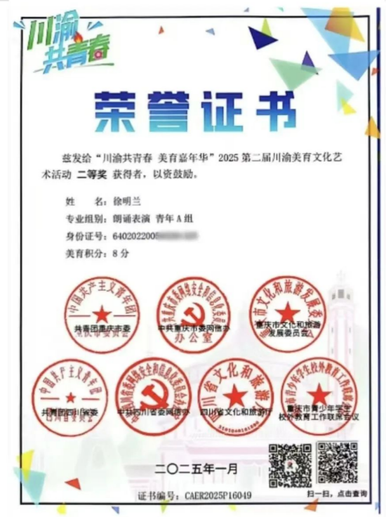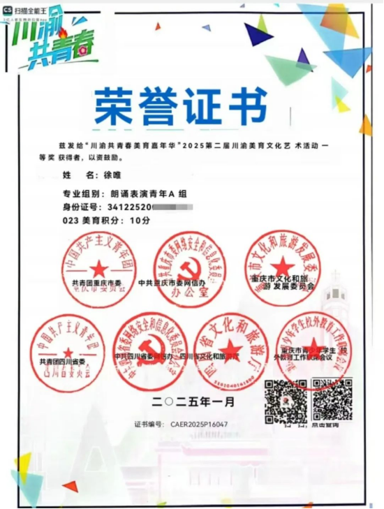 “川渝共青春 美育嘉年华”比赛于2024年8月至2025年1月开展初赛、复赛及总决赛。播音主持艺术学院播音与主持艺术专业徐唯和徐明兰同学在此次活动中分别荣获青年A组一等奖和二等奖;张靖伟老师获得优秀指导教师奖。