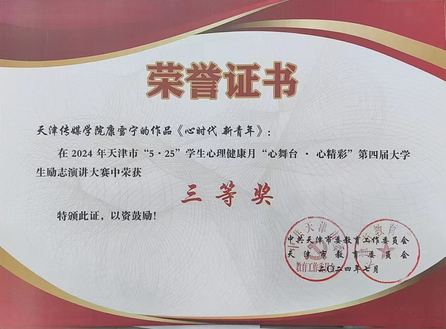 (我部心理健康教育老师指导学生荣获2024年天津市“心舞台•心精彩”第四届大学生励志演讲大赛三等奖)