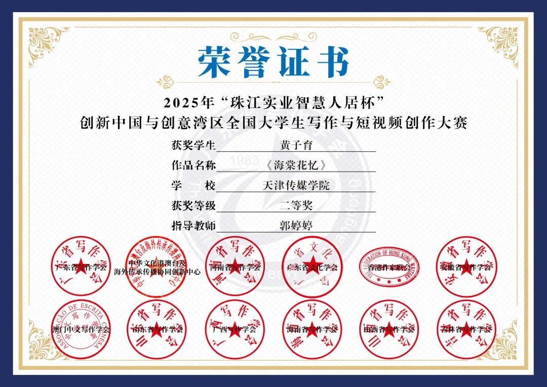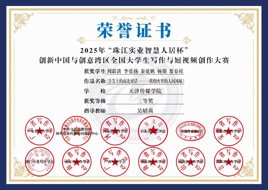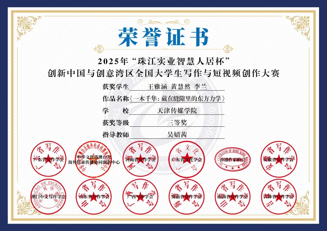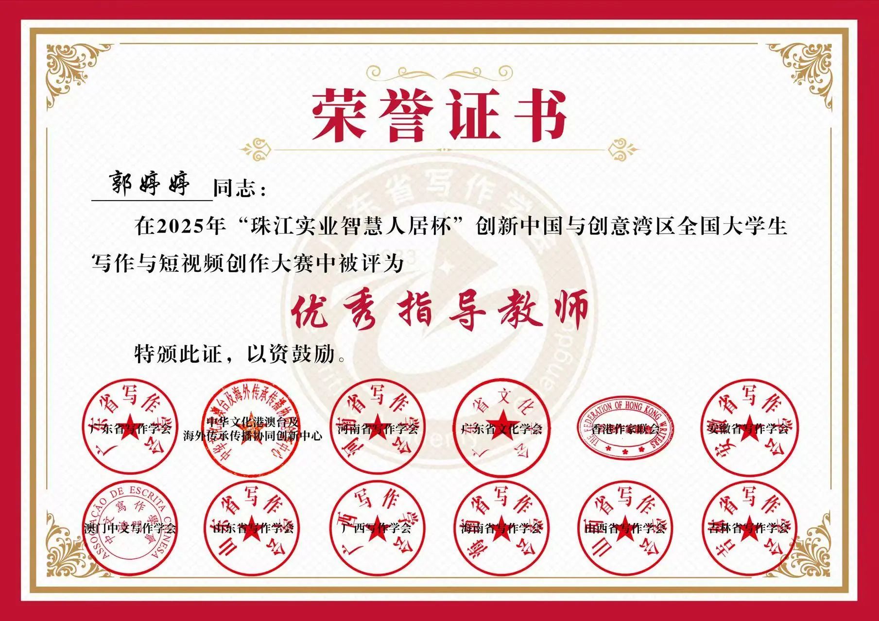 此外,在 "珠江实业智慧人居杯" 创新中国与创意湾区全国大学生写作与短视频创作大赛中,汉语言文学专业教师郭婷婷、吴婧茜、陈庆予、董格菲荣获 "优秀指导教师"。这不仅是对教师长期深耕专业领域的高度认可,更彰显了我校教师队伍在教学创新领域的卓越实力。