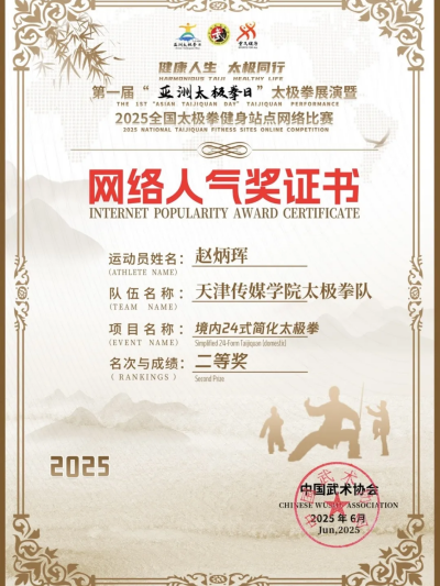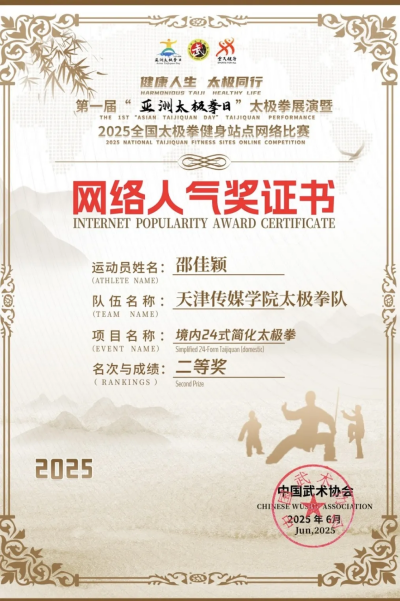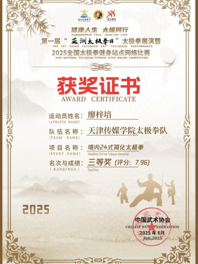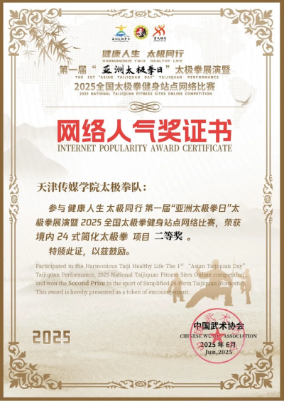在首届“亚洲太极拳日”展演暨2025全国太极拳网络大赛中,天津传媒学院学校太极拳队凭借扎实功底与默契配合,一举斩获境内24式简化太极拳团体三等奖、网络人气奖团体二等奖,以及个人评分奖三等奖七项、网络人气奖二等奖七项,共十六个奖项,为校争光!