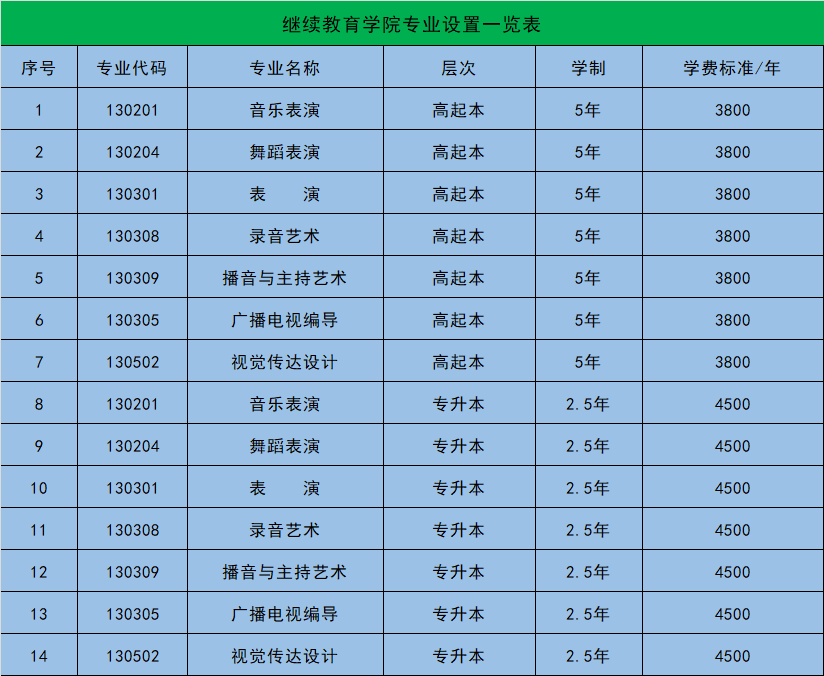 天津传媒学院继续教育学院(高等学历继续教育)面对应届、往届毕业生及成人开设音乐表演、表演、舞蹈表演、录音艺术、播音与主持艺术、广播电视编导、视觉传达设计7个本科专业,均设置高起本、专升本学历层次。学院依靠现有本科专业背景和师资、设施等办学条件,按照继续教育各专业人才培养方案组织教学,采取“线上与线下相结合、面授与自学相结合”的方式,培养品德优良、基础扎实、实践能力强,适应经济和社会发展需要的应用型专业人才。