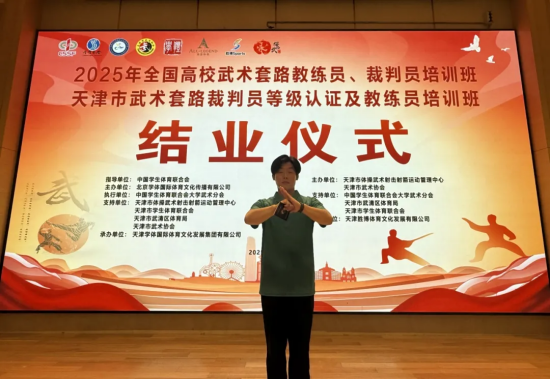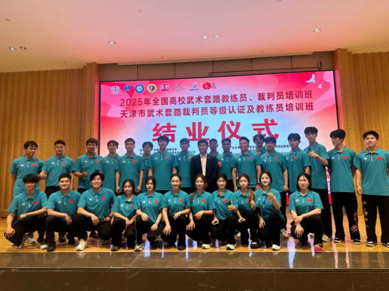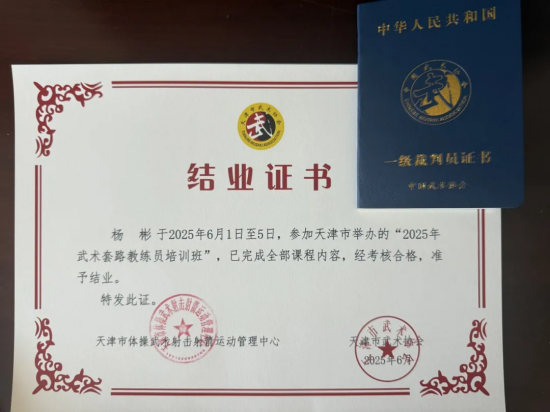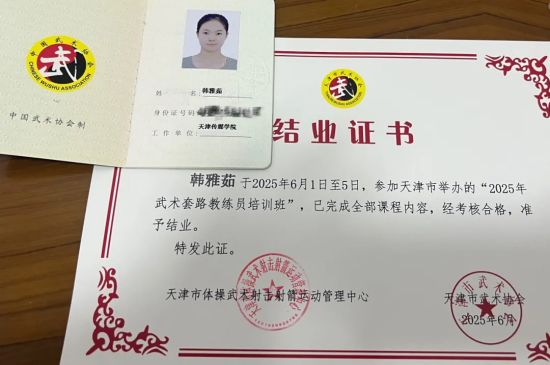 近日,由天津市体操武术射击射箭运动管理中心和天津市武术协会联合主办的天津市武术套路裁判员等级认证、教练员培训班活动在天津市武清开发区新源道18号奥蓝际德国际酒店顺利举行。在此次培训中,我校武术专项老师杨彬荣获教练员和一级裁判员称号,太极拳专项体育老师韩雅茹荣获教练员和三级裁判员称号。