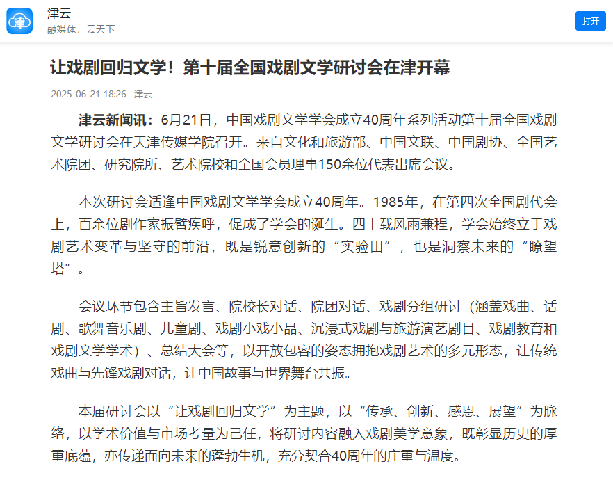 中国戏剧文学学会主办、天津传媒学院承办的中国戏剧文学学会成立40周年系列活动——第十届全国戏剧文学研讨会:让戏剧回归文学,6月21日至22日在天津传媒学院成功举办。来自国家文化和旅游部、中国文联、中国剧协、全国艺术院团、科研院所、高等学校以及全国会员理事等150余位代表齐聚一堂,共话戏剧文学艺术发展,以敬畏之心回望来时路,以澎湃之情展望新时代。