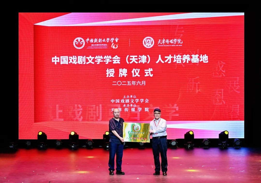 会议期间,举行了中国戏剧文学学会(天津)人才培养基地授牌仪式。中国戏剧文学学会会长羊驰为天津传媒学院授牌,天传执行校长李晓华接牌。这标志着中国戏剧文学学会在天津传媒学院正式建立戏剧人才培养基地,为学校戏剧人才培养注入新动能。