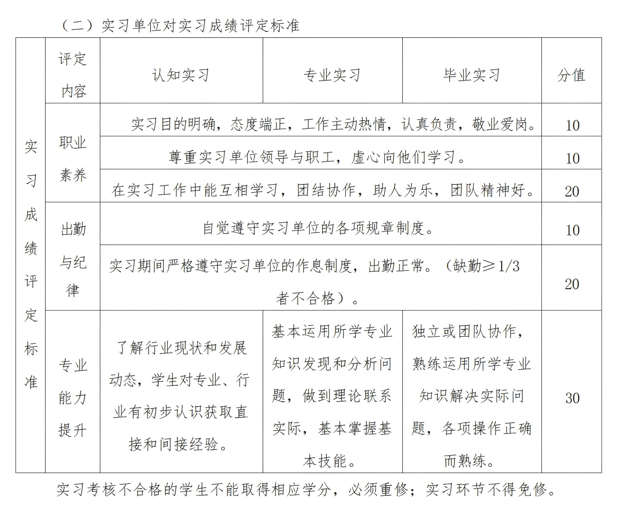 认知实习、专业实习和毕业实习考核成绩分别由实习单位与指导教师按百分制评分,最终成绩按实习单位和指导教师评分 4:6 组成评定,采用百分制计算方式(以整数计数)。