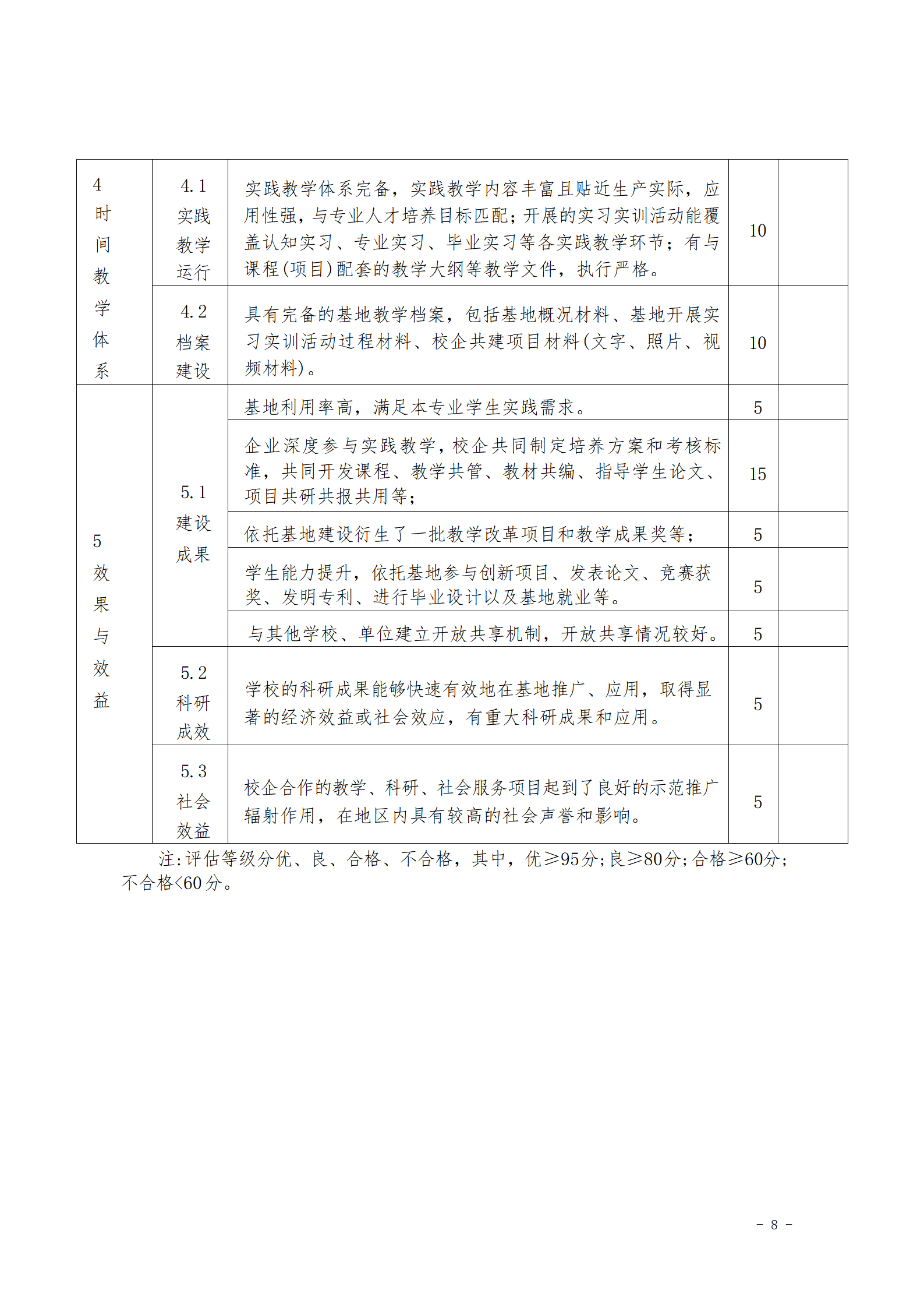 1.校企合作办公室将根据实践基地的不同类型和运管情况,会同教务处等相关部门,每年组织对基地的使用进行评估和运行检查(评估指标见附件),对运行情况良好的基地推荐建设校级、省级、国家级基地项目。
