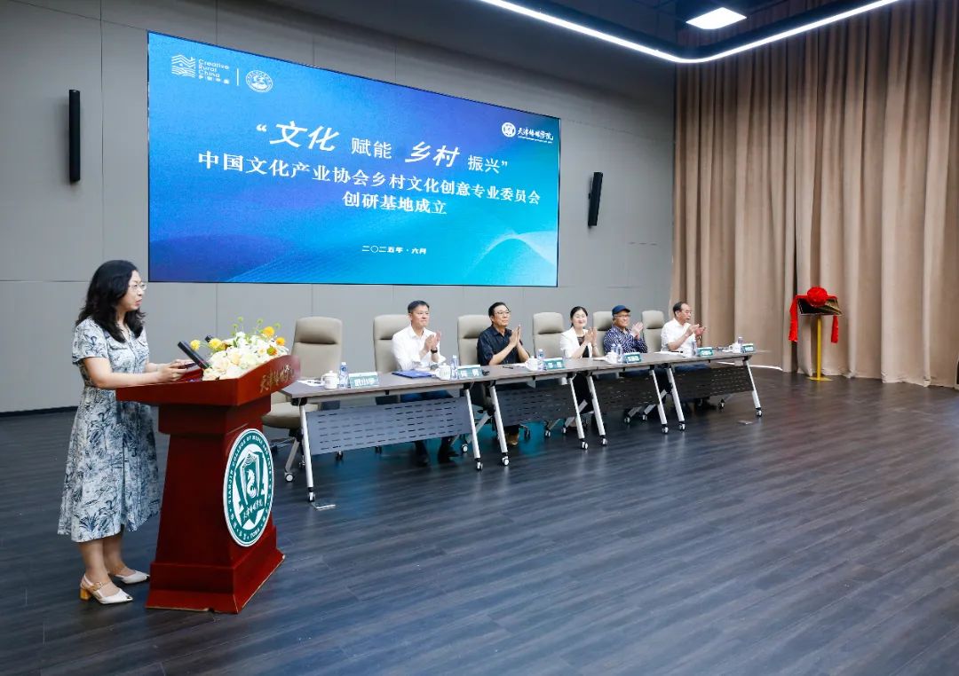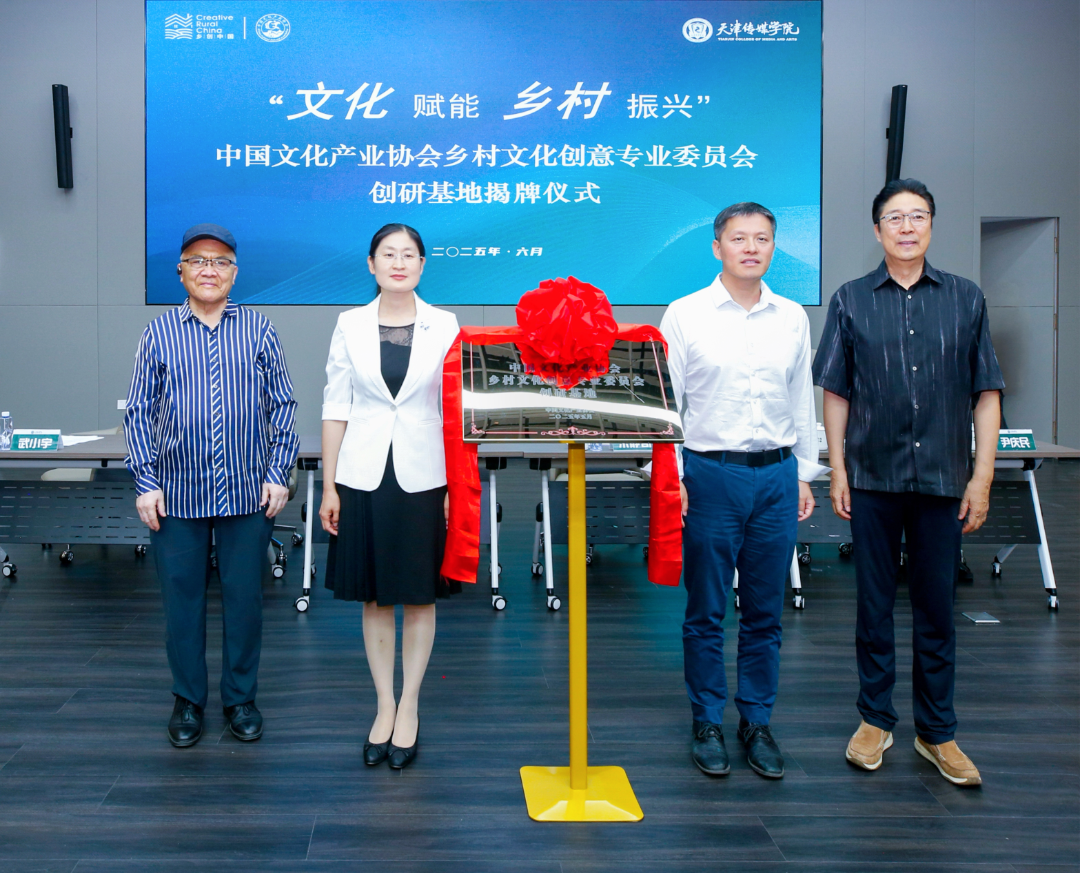 随后,天津市蓟州区副区长朱静奇,中国文化产业协会乡村文化创意专业委员会主任委员、北京大学文化产业研究院院长、联合国教科文组织乡村创意与可持续发展教席主持人教授向勇,天津传媒学院校长李罡、执行校长李晓华携手为创研基地揭牌,在场师生共同见证了这一历史性的时刻。
