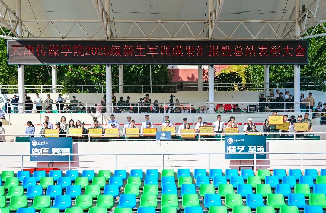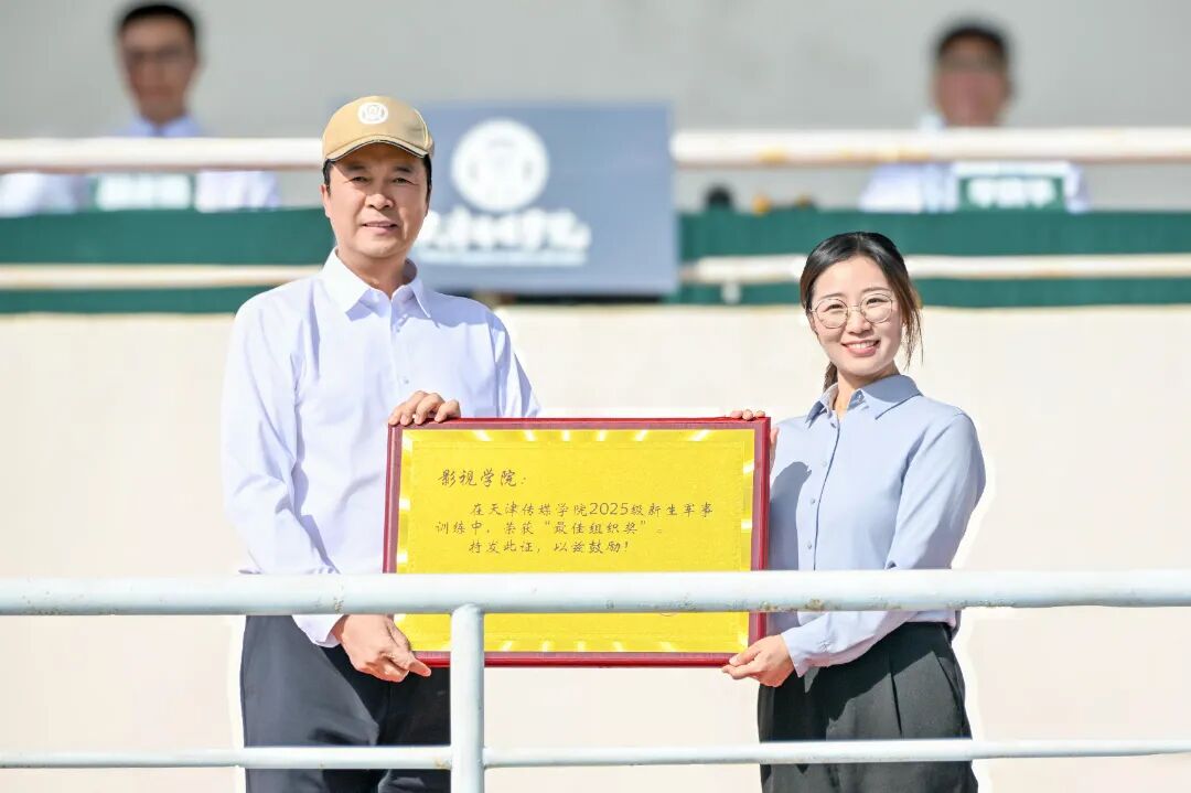 大会表彰环节,执行校长李晓华宣读了《天津传媒学院关于2025级新生军事训练先进个人、先进集体的表彰决定》。现场先后颁发“优秀教官”“优秀指导员”“优秀学员”“军训标兵”等个人奖项,以及“最佳方阵奖”“军事训练科目最佳表演奖”“最佳组织奖”等集体奖项。李罡校长等校领导为获奖代表颁奖。