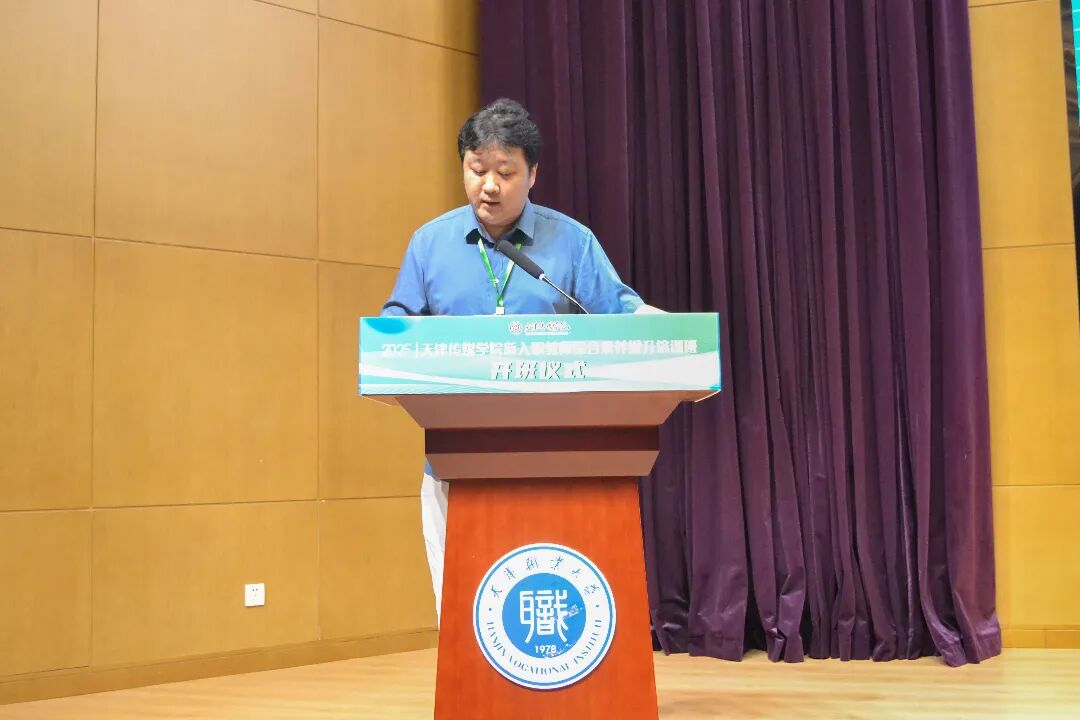 开班仪式伊始,天津职业大学党委委员、副校长冯艳文代表承办方致辞。他首先对天津传媒学院新入职教师的到来表示热烈欢迎,并详细介绍了天津职业大学的办学优势与培训经验。他强调,为做好本次培训,天津职业大学前期精心定制方案,整合校内外优质师资与实训资源,组建专属管理服务团队,力求为新教师打造 “理论扎实、实操性强、贴合需求” 的培训课程。同时,他也期待两校以此次合作为契机,深化教育教学交流,共同推动高等教育高质量发展。