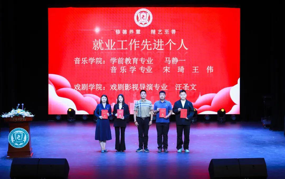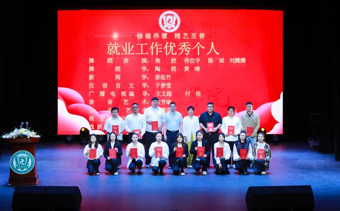 副校长王月芹宣读了《天津传媒学院关于2024 年就业创业工作优秀个人、先进个人及先进集体的表彰决定》。15 名教师荣获 “就业工作优秀个人” 称号,4 名教师荣获 “就业工作先进个人” 称号,舞蹈学院被授予 “高质量就业先进单位” 和 “就业创业工作先进单位” 称号。校领导为获奖的集体和个人颁奖。