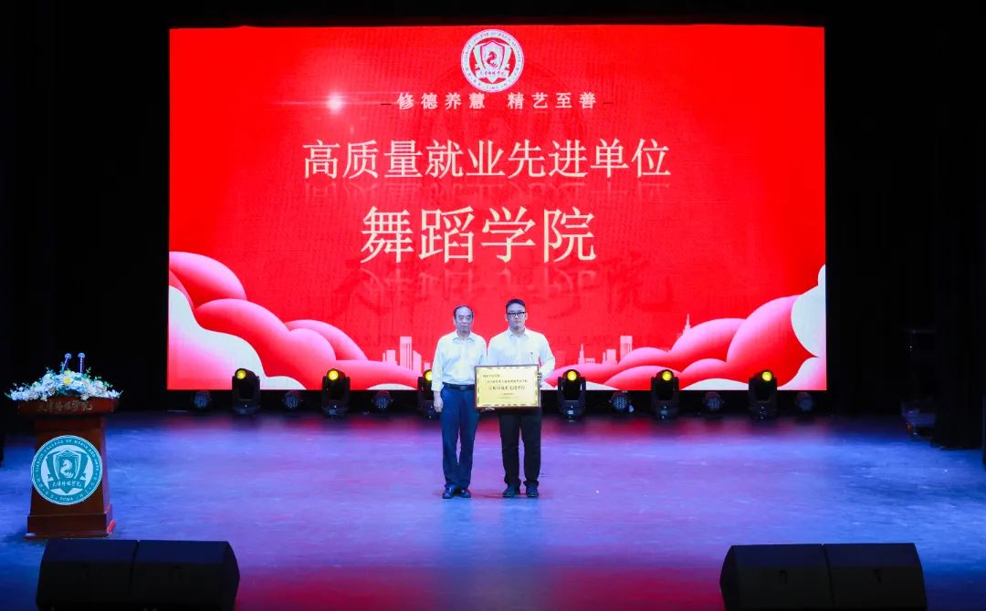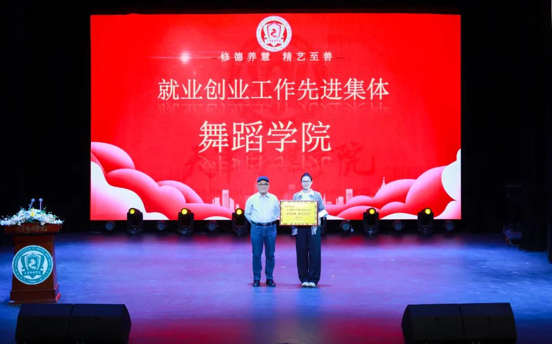 执行校长李晓华为舞蹈学院院长陈文童颁发“就业创业工作先进单位”奖