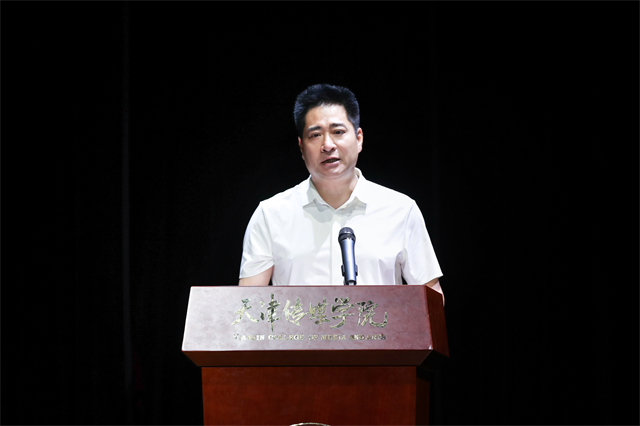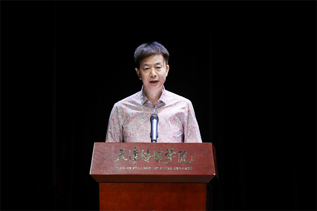 原北京戏剧家协会秘书长、驻会副主席、北京影偶艺术周艺术总监、影偶剧《星鱼》艺术总监杨乾武在致辞中介绍了影偶剧《星鱼》的创作背景与艺术价值。他指出,2025版《星鱼》由北京市文联出品,由韩非子剧社、天津传媒学院、天津儿艺联合制作。本次校企合作充分整合各方优势资源,为新版《星鱼》的复排巡演筑牢基础,更为学校师生提供了宝贵的舞台实践,有力地推动了艺术教育与戏剧产业的深度融合。